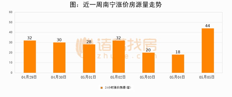 根据诸葛找房数据显示,南宁24小时涨价房源量为44套,较05月04日增加26套,环比上涨144.4%。与此同时,涨价房源占比小幅扩大,业主信心有所提升。