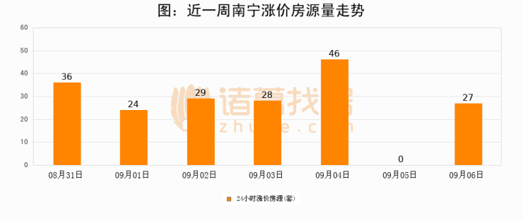 根据诸葛找房数据显示,南宁24小时涨价房源量为27套,较09月05日增加27套,环比上涨0%。与此同时,涨价房源占比小幅扩大,业主信心有所提升。