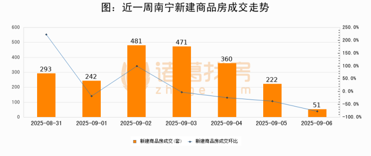 根据南宁市住房和城乡建设局数据显示,2025年09月06日南宁新建商品房成交51套,较昨日减少171套,环比下降77%。近一周南宁新建商品房日均成交303套。09月06日单日成交51套,低于近一周平均水平83.2%。