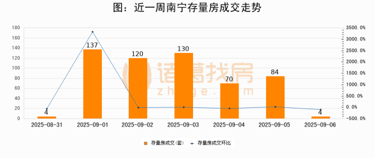 从存量房来看,2025年09月06日南宁存量房单日成交4套,比昨日减少80套,环比下降95.2%。从近一周存量房成交来看,南宁存量房日均成交套数为78套,09月06日单日成交4套,低于近一周平均水平94.9%。