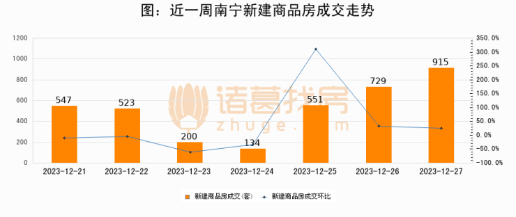 根据南宁市住房和城乡建设局数据显示,2023年12月27日南宁新建商品房成交915套,较昨日增加186套,环比上涨25.5%