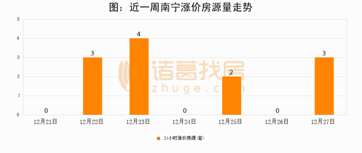 根据诸葛找房数据显示,南宁24小时涨价房源量为3套,较12月26日增加3套,环比上涨0%。与此同时,涨价房源占比小幅扩大,业主信心有所提升。