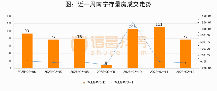 从存量房来看,2025年02月12日南宁存量房单日成交77套,比昨日减少34套,环比下降30.6%。从近一周存量房成交来看,南宁存量房日均成交套数为78套,02月12日单日成交77套,低于近一周平均水平1.3%。
