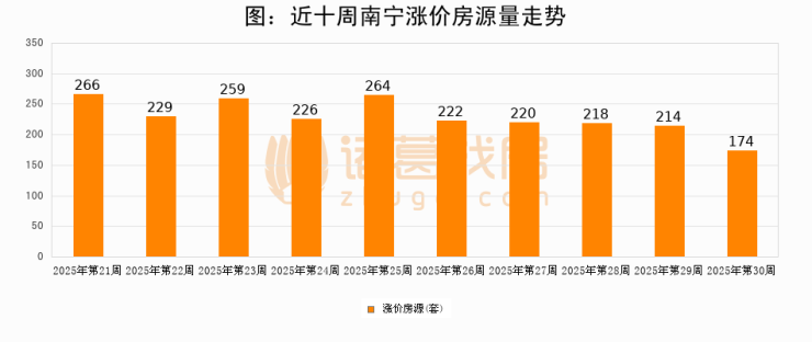 从调价房源来看,第30周南宁涨价房源174套,较上周下降18.7%。与此同时,30周涨价房源占比回落0.66个百分点,业主信心小幅波动,购房者可则需入市。