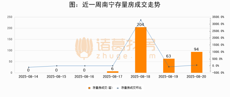 从存量房来看,2025年08月20日南宁存量房单日成交94套,比昨日增加31套,环比上涨49.2%。从近一周存量房成交来看,南宁存量房日均成交套数为52套,08月20日单日成交94套,高于近一周平均水平80.8%。