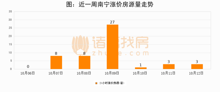 根据诸葛找房数据显示,南宁24小时涨价房源量为3套,较10月11日持平。