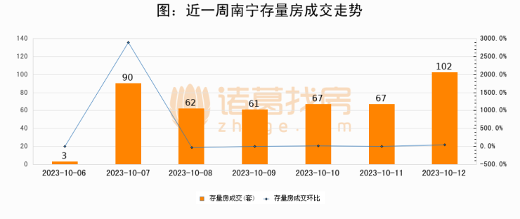 从存量房来看,2023年10月12日南宁存量房单日成交102套,比昨日增加35套,环比上涨52.2%。从近一周存量房成交来看,南宁存量房日均成交套数为64套,10月12日单日成交102套,高于近一周平均水平59.4%。