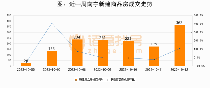根据南宁市住房和城乡建设局数据显示,2023年10月12日南宁新建商品房成交363套,较昨日增加188套,环比上涨107.4%