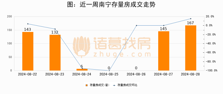 从存量房来看,2024年08月28日南宁存量房单日成交167套,比昨日增加22套,环比上涨15.2%。从近一周存量房成交来看,南宁存量房日均成交套数为84套,08月28日单日成交167套,高于近一周平均水平98.8%。
