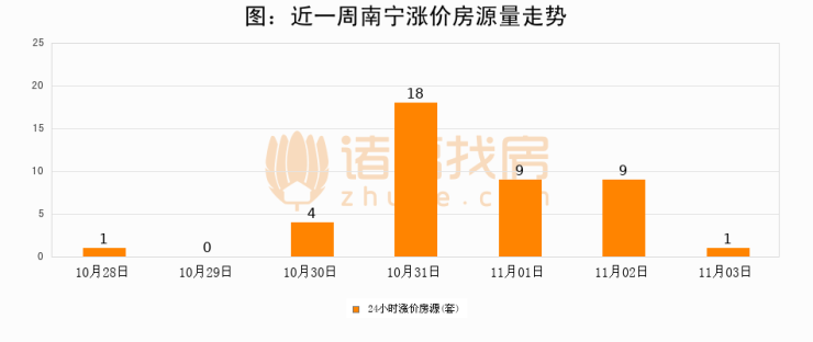 根据诸葛找房数据显示,南宁24小时涨价房源量为1套,较11月02日减少8套,环比下降88.9%。与此同时,涨价房源占比小幅回落,对于购房者来说是一个入市窗口期,购房者可抓住时机入市。