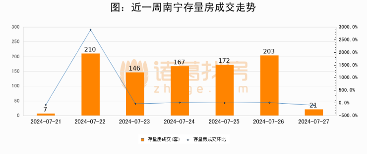 从存量房来看,2024年07月27日南宁存量房单日成交21套,比昨日减少182套,环比下降89.7%。从近一周存量房成交来看,南宁存量房日均成交套数为132套,07月27日单日成交21套,低于近一周平均水平84.1%。