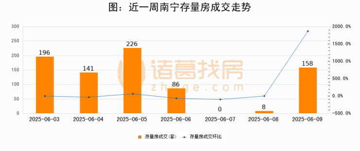 从存量房来看,2025年06月09日南宁存量房单日成交158套,比昨日增加150套,环比上涨1875%。从近一周存量房成交来看,南宁存量房日均成交套数为116套,06月09日单日成交158套,高于近一周平均水平36.2%。