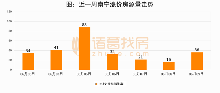 根据诸葛找房数据显示,南宁24小时涨价房源量为36套,较06月08日增加20套,环比上涨125%。与此同时,涨价房源占比小幅扩大,业主信心有所提升。