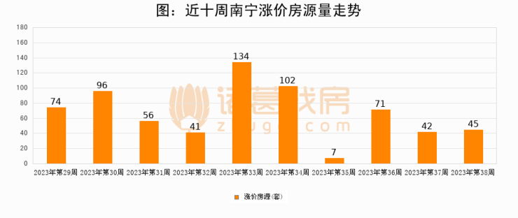 从调价房源来看,第38周南宁涨价房源45套,较上周上涨7.1%。与此同时,38周涨价房源占比回落0.24个百分点,业主信心小幅波动,购房者可则需入市。