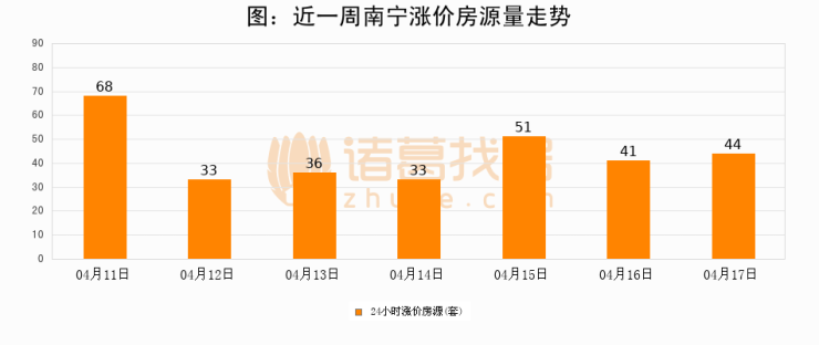 根据诸葛找房数据显示,南宁24小时涨价房源量为44套,较04月16日增加3套,环比上涨7.3%。与此同时,涨价房源占比小幅扩大,业主信心有所提升。