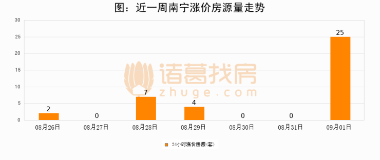 根据诸葛找房数据显示,南宁24小时涨价房源量为25套,较08月31日增加25套,环比上涨0%。与此同时,涨价房源占比小幅扩大,业主信心有所提升。