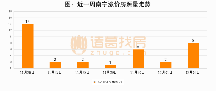 根据诸葛找房数据显示,南宁24小时涨价房源量为8套,较12月01日增加6套,环比上涨300%。与此同时,涨价房源占比小幅扩大,业主信心有所提升。
