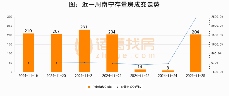 从存量房来看,2024年11月25日南宁存量房单日成交204套,比昨日增加196套,环比上涨2450%。从近一周存量房成交来看,南宁存量房日均成交套数为154套,11月25日单日成交204套,高于近一周平均水平32.5%。