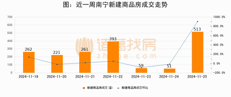 根据南宁市住房和城乡建设局数据显示,2024年11月25日南宁新建商品房成交513套,较昨日增加462套,环比上涨905.9%